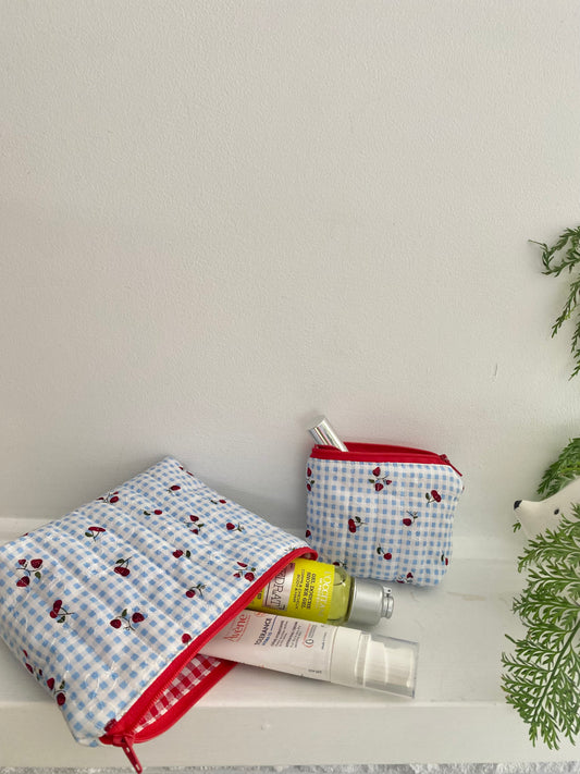 Strawberry&Cherry Gingham Makeup Pouches(blue)