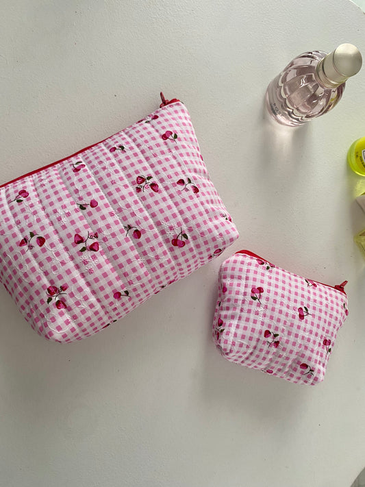 Strawberry&Cherry Gingham Makeup Pouches(pink)